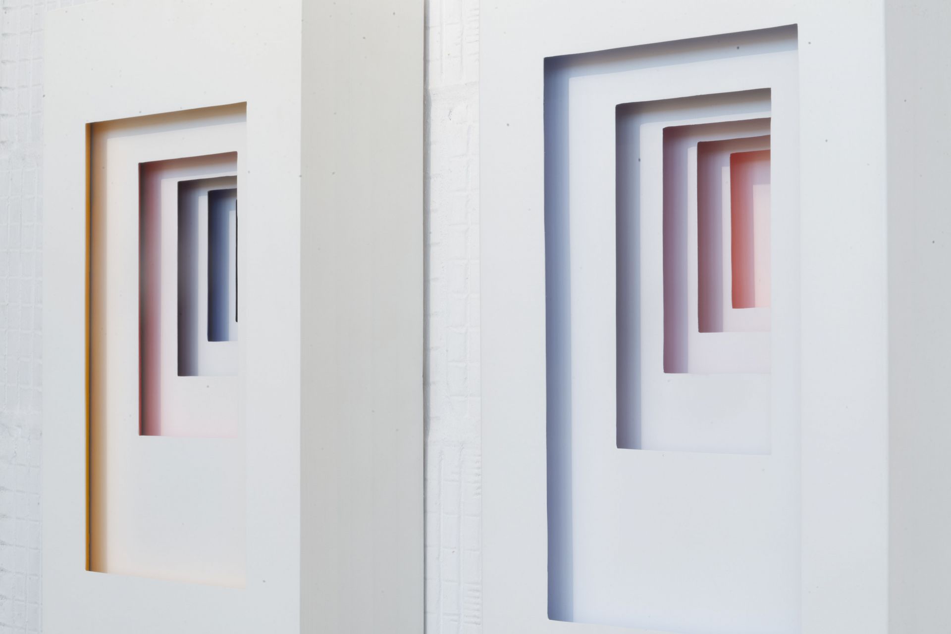 In the Veszprém exhibition visitors can see his small-scale works entitled From Orange to Black (2015) and From Blue to Orange (2015). The works, made of plywood and painted wooden boxes (one darkened on the outside, the other lightened on the inside), appear as a small altar. The different coloured layers on the white frame produce reflections of different colours; they are thus linked to colour studies and optical phenomena. Erik Mátrai has also created similar installations that fill the whole room, but which point even further ahead, where one moves inwards along the stations, as if on a calvary, through the different coloured gates, while the space becomes transparent.